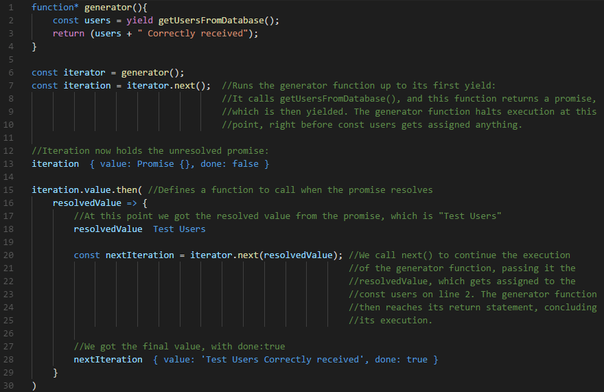 A generator function can yield a promise (for example an async task), and its iterator can be controlled to halt for this promise to resolve (or reject), and then proceed with the resolved (or rejected) value. Inside of the generator, the response from the ajax call will be assigned to result1. 16/07/2015 · once the ajax call is complete and the promise resolves, the.then() function will execute, and the response from the ajax call will be passed back into the ajaxgenerator function (as a result of invoking.next(result1)). 23/03/2016 · the await keyword is only to be used in async functions, while the yield keyword is only to be used in generator function*s. 24/02/2021 · the main takeaway is that to make generator functions play nice with typescript, you have to set a return value of iterableiterator, where number is any basic typescript type that it returns.