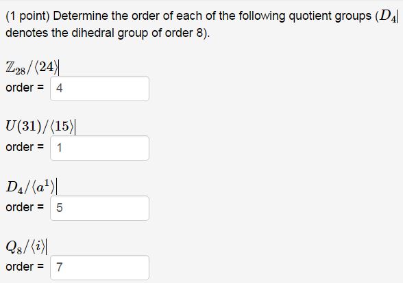 I am confused about how to find the subgroup of a quotient group given a generator. I have one simple question regarding quotient groups. 03/03/2017 · suppose we have a quotient $(\mathbb{z}/8\mathbb{z})^*/\langle 3\rangle=\{\{1,3\},\{5,7\}\}$ where $(\mathbb{z}/8\mathbb{z})^*=\{1,3,5,7\}$ is a multiplicative group. If there is a quotient group which consists of all remainders when an integer is divided by 12 such group could be considered as a cyclic group generated by a … Quotient group, the first part of the theorem in question has been established.