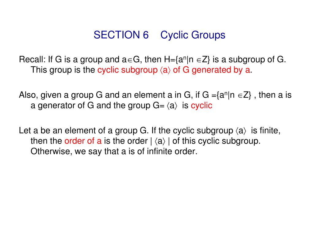 (a cyclic group may have many generators.). Given any group g at all and any g ∈ g we know that 〈g〉 is a cyclic subgroup . We say a is a generator of g. When someone talks about the cyclic group of a. The most basic examples of finite cyclic groups are z/(m) with (additive) generator 1 and.